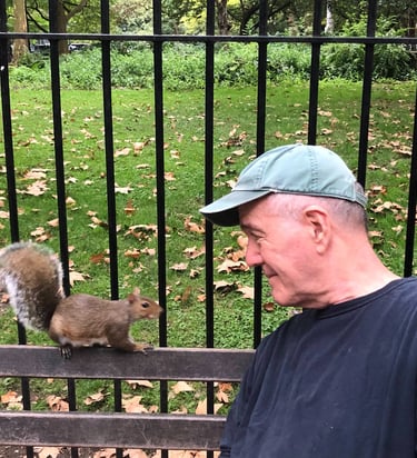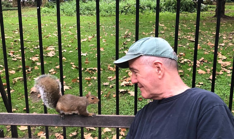Seit 25 Jahren kommt der 72-jährige New Yorker Ron fast täglich in den City Hall Park – um seine Eichhörnchen zu füttern. (2025)